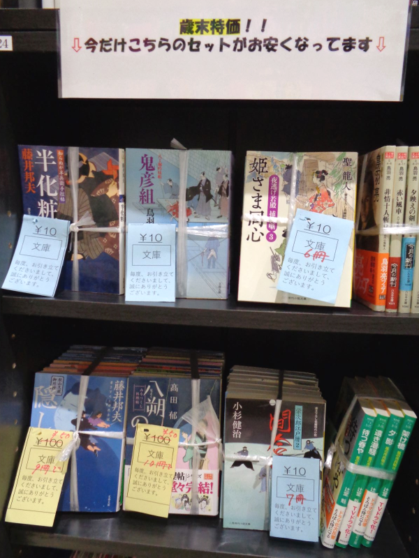 なごやか文庫 歳末セール 2020年12月14日 最終更新日時 : 2022年12月6日 (Google共有アカウント)やまて 12/5~期間限定で歳末セールとして100円コーナーの本を半額にします。値札に【半】と赤字で記載されてあるものが対象となります。 4冊まとめて10円~の文庫や書籍も並べています。お正月用にまとめ買いがお得ですよ。 3冊100円 堂場瞬一(完売)に始まり 赤川次郎(完売)、現在は西村京太郎です。その後も南 英雄・濱 嘉之と続きます。どうぞお楽しみに❤